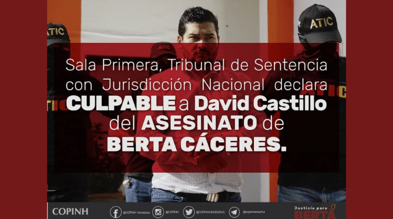 El Consejo Cívico de Organizaciones Populares e Indígenas de Honduras, COPINH, el equipo legal del Movimiento Amplio por la Dignidad y la Justicia, junto a las hijas, hijo y madre de Berta Cáceres ante el fallo condenatorio contra el imputado David Castillo por el asesinato de nuestra compañera Berta Cáceres, proferido por la sala Primera del Tribunal de Sentencia con Jurisdicción Nacional, hacemos del conocimiento de la comunidad Nacional e Internacional lo siguiente: